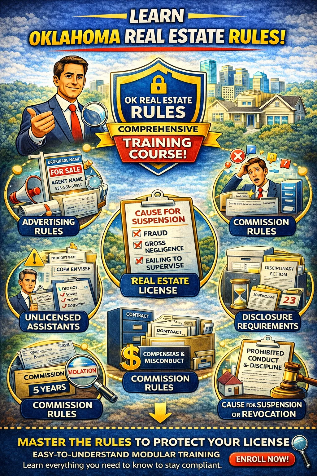 This course breaks down Oklahoma license codes and Real Estate Commission rules in plain language, with real-world examples of where agents get into trouble, and how to avoid it. You’ll learn how license status, broker and associate responsibilities, advertising, social media, unlicensed assistants, trust accounts, earnest money, commissions, disclosures, record retention, and disciplinary actions all tie together.